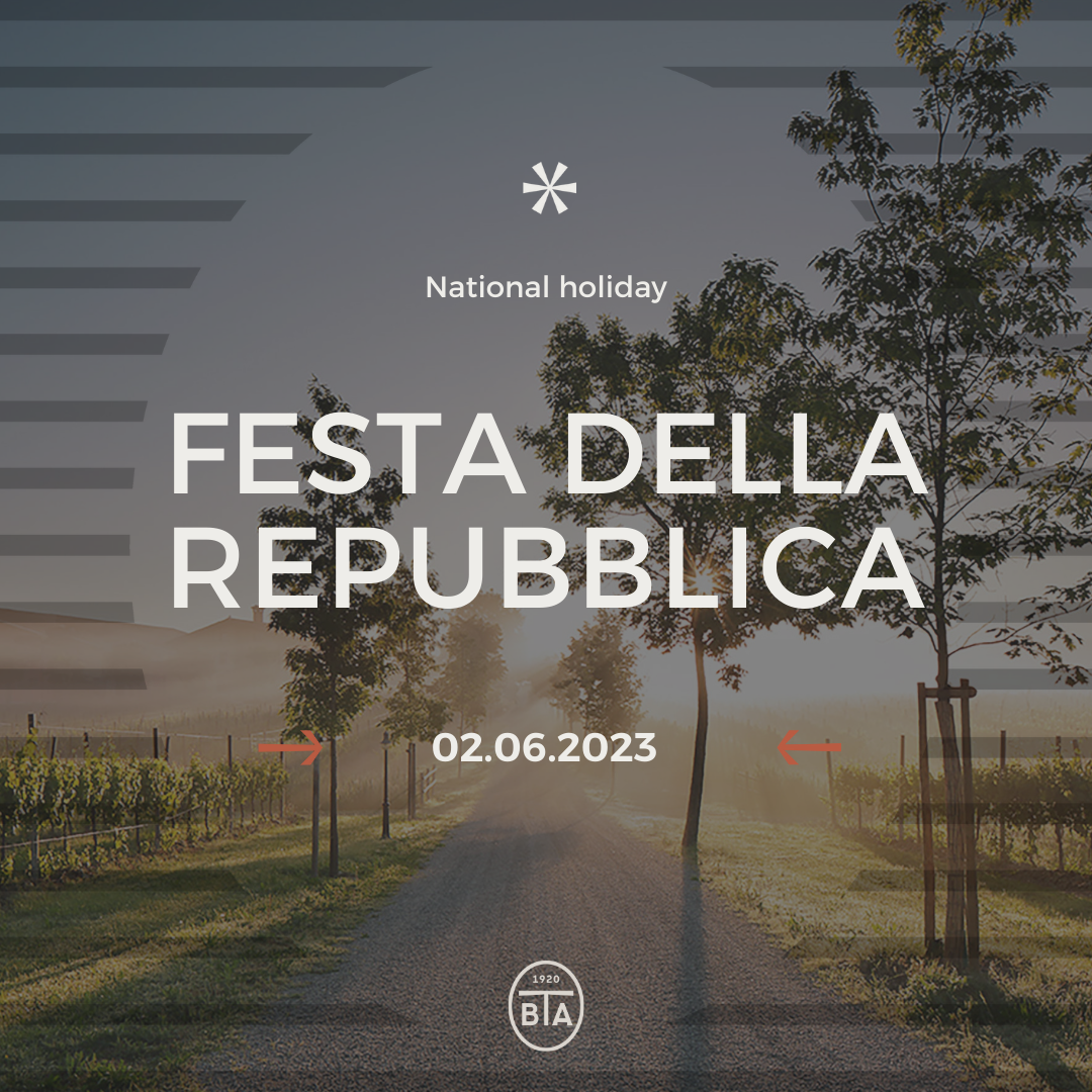 L'azienda resta chiusa il giorno 2 giugno per la Festa della Repubblica. Riapriremo regolarmente lunedì 5 giugno.