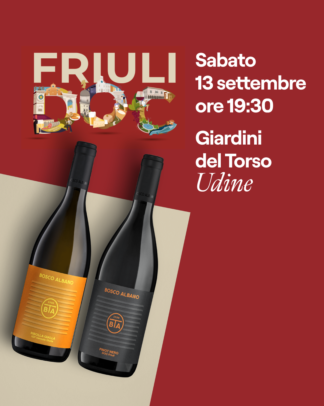 Bosco Albano partecipa alla nuova edizione di Friuli DOC, il grande evento che animerà Udine dal 12 al 14 settembre con le eccellenze del territorio. Sabato 13 settembre, alle ore 19:30, saremo protagonisti di una degustazione organizzata da Confagricoltura ai Giardini del Torso: due dei nostri vini, la Ribolla Gialla e il Pinot Nero, incontreranno la trota dell’azienda La Trute, in un abbinamento che racconterà la vera anima friulana. L’ingresso è gratuito, a numero chiuso, con prenotazione gradita. Un appuntamento da non perdere per vivere insieme l’autenticità e la convivialità del Friuli.