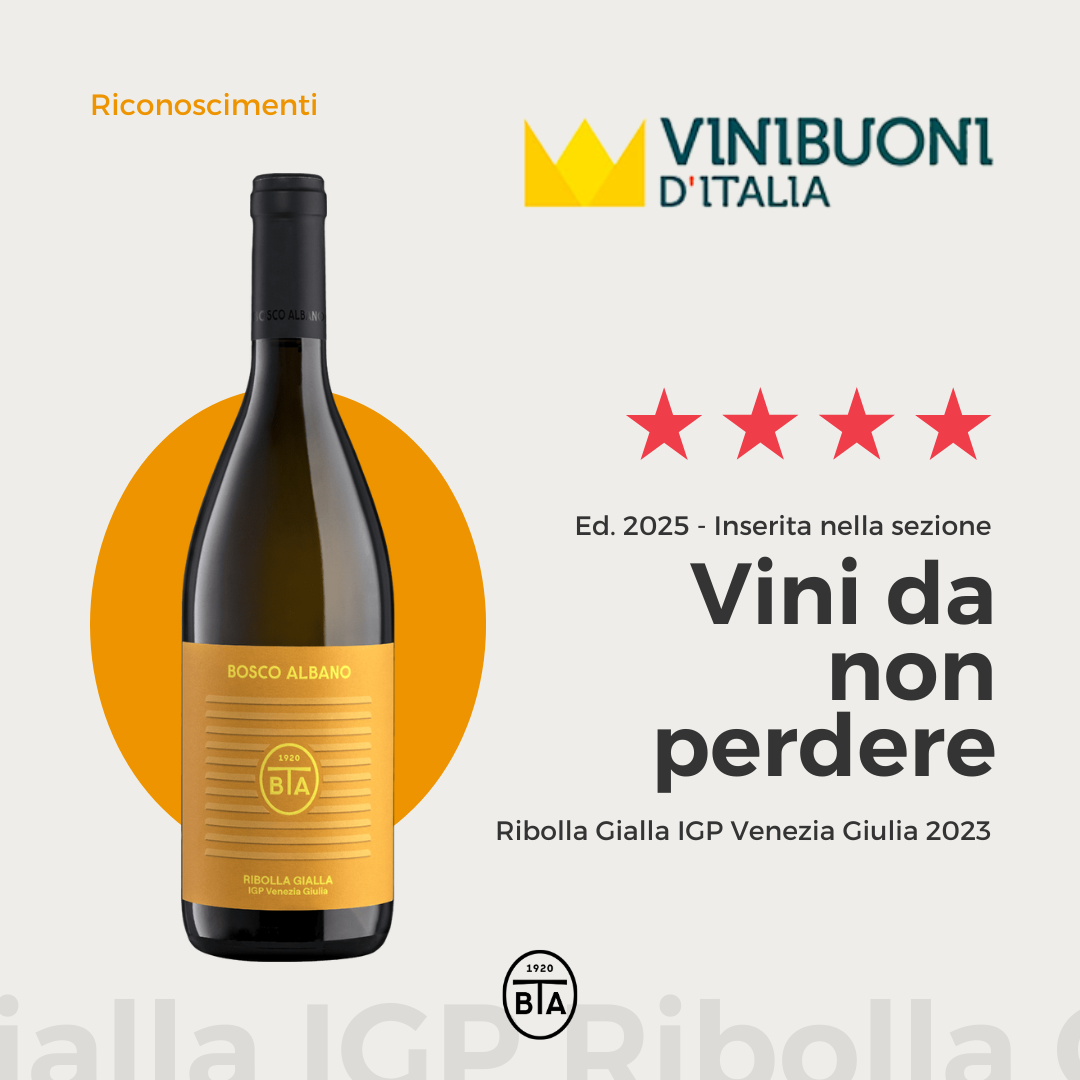 La guida Vinibuoni d’Italia 2025, edita dal Touring Club, ha inserito la nostra Ribolla Gialla IGP Venezia Giulia 2023 nella sezione “Vini da non perdere” e le ha assegnato la valutazione massima di 4 stelle ⭐️⭐️⭐️⭐.